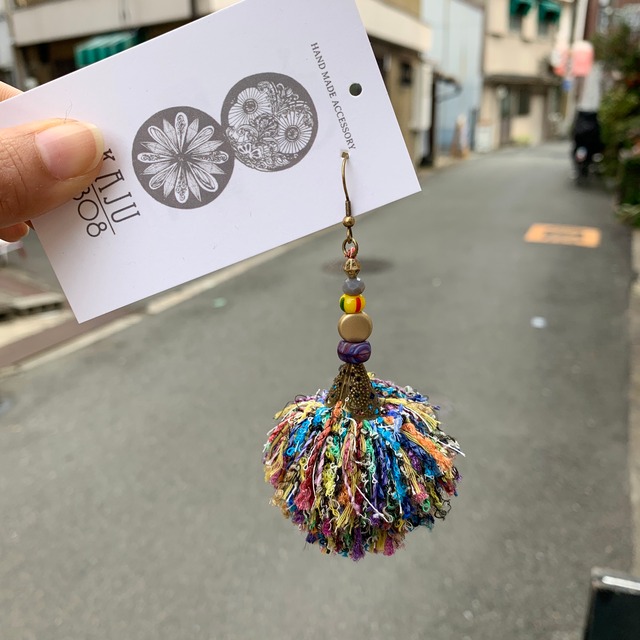 やっぱりアジアが好き!! な方にはたまらない作品が出来ました。。笑 私自身、大好きなピアスです。 お友達のお母様の大切な毛糸を分けていただいて作らせていただきました。 一点ものになります。 着画は大きさの見本にしていただきたいです。 詳しい画像をご希望の方はご連絡くださいね!! 手作りのため、それぞれ色合いが異なります。 ハンドメイドの風合いとして、お楽しみいただけたら幸いです。 ※写真は見本です。 *素材* 基本は真鍮メッキです。 ピアスはチタン・樹脂に変更可 イヤリングはネジバネ式・クリップ式・ノンホール樹脂に変更可 *取扱いについて* ・壊れにくいように加工しておりますが強い力や衝撃で割れてしまう事がございますのでお取り扱いに注意していただけると幸いです。 ・毛糸などの素材を使っている作品が多い為、水に濡らさないほうが長くお使いいただけます。濡れてしまった場合は、早めに柔らかい布で拭いていただくことをお勧めいたします。 *ハンドメイドについて* ・手作りのため、同じデザインのものでも、色の濃淡、サイズ、模様にそれぞれ違いがございます。 ・丁寧を心掛けていますが、小さな傷や歪みやなど至らない点があると思います。ハンドメイドの温かさとしてお楽しみいただけたら幸いです。 ・天然素材(天然石等)を使用している作品の場合、傷等があることがございます。天然ものの風合いとご理解いただけたら幸いです。 *その他* ・複製目的・模造目的のご購入は固くお断りいたします。 ・転売目的のご購入はご遠慮ください。 ・パソコン・カメラ・照明等の加減で実際の色と違って見えることがあります。