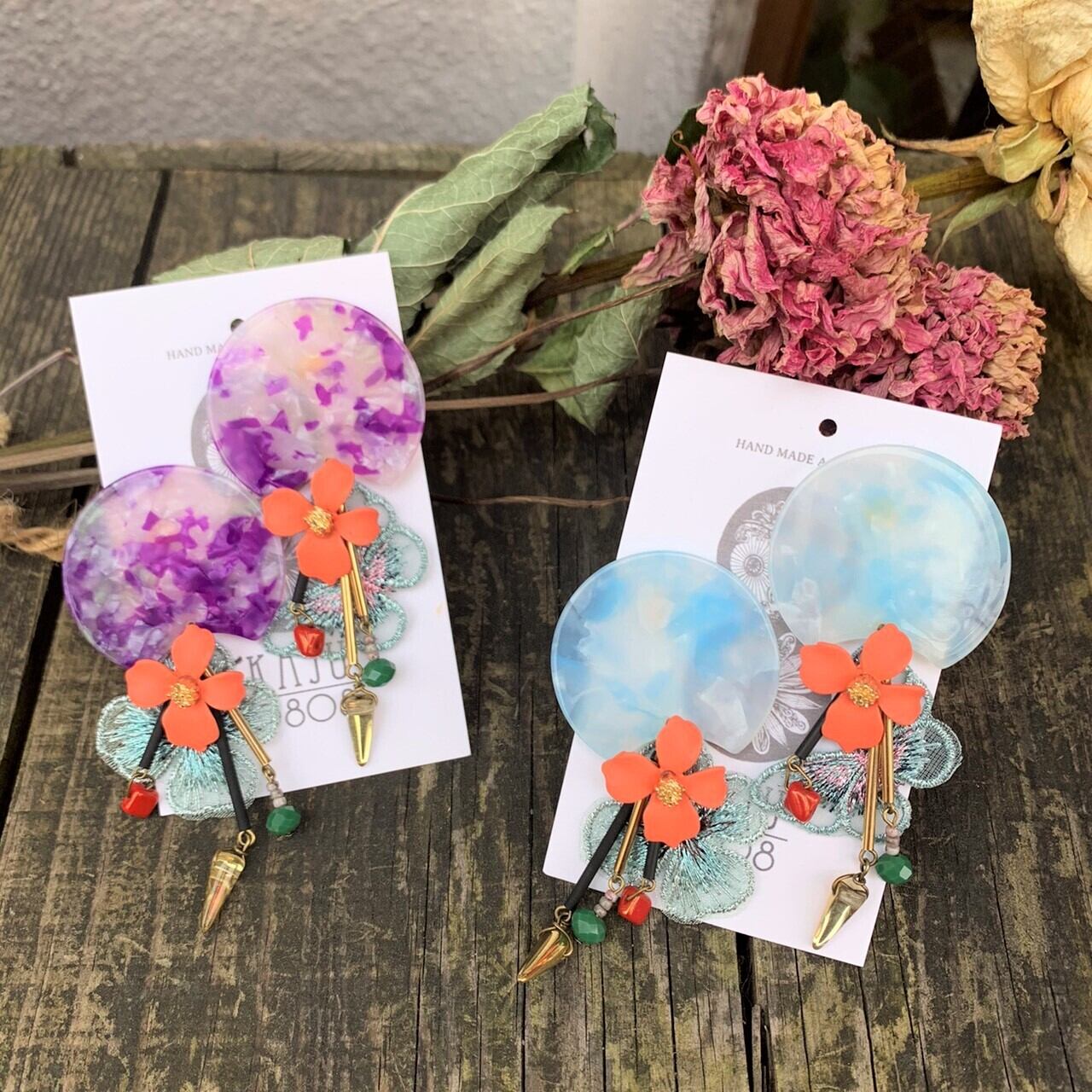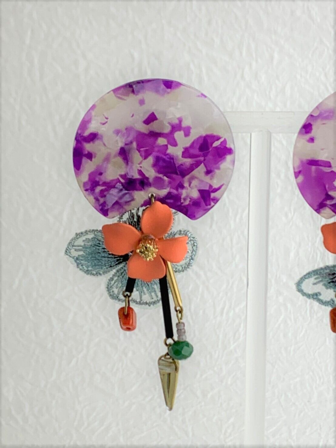 懐かしいお花の色合いを持ったアクリルのパーツに、マットオレンジのメタル花や