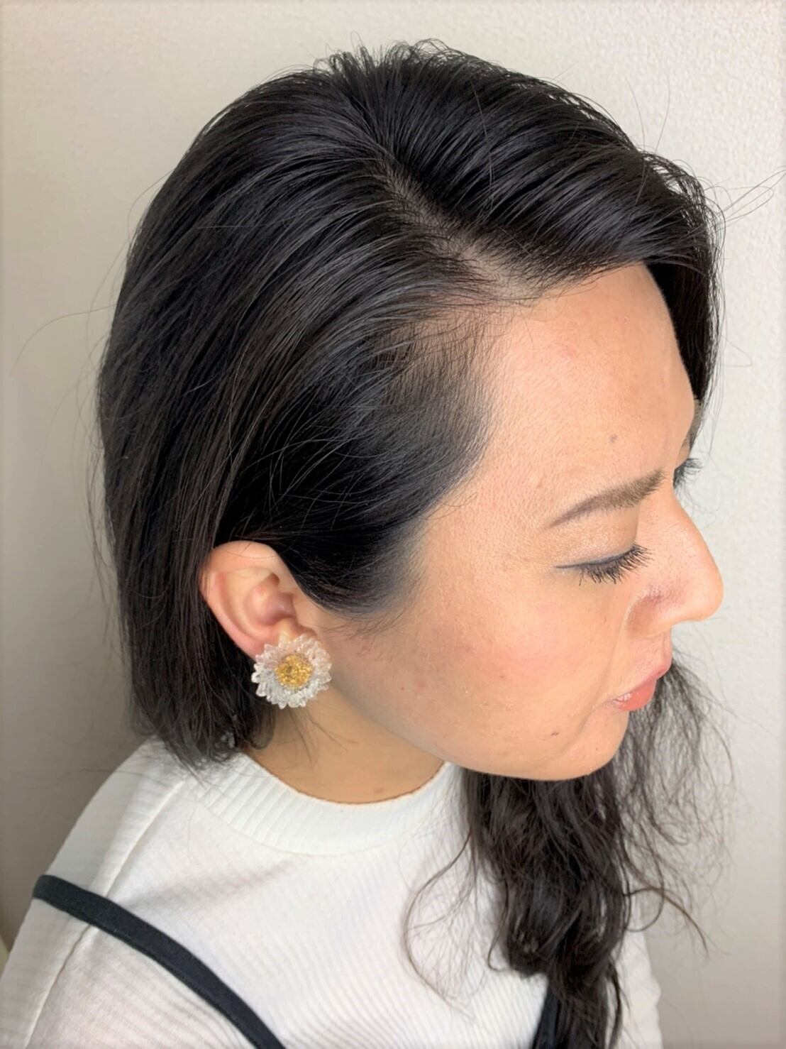 着けると耳の肌色が映って、より肌馴染みのよい作品です。