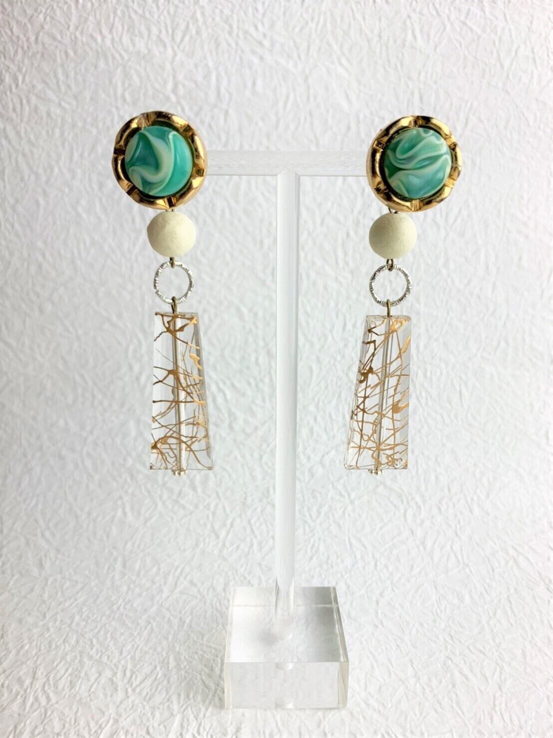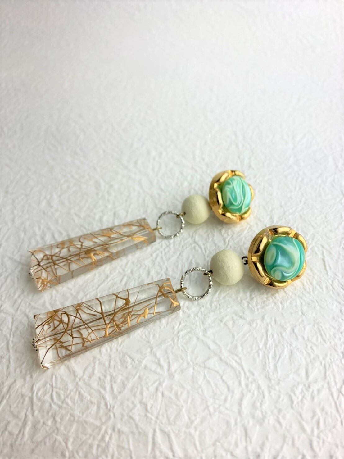 優しいマーブルターコイズの色目のボタンと四角のアクリルに落書きをしたようなパーツをぶらぶらとつけました。