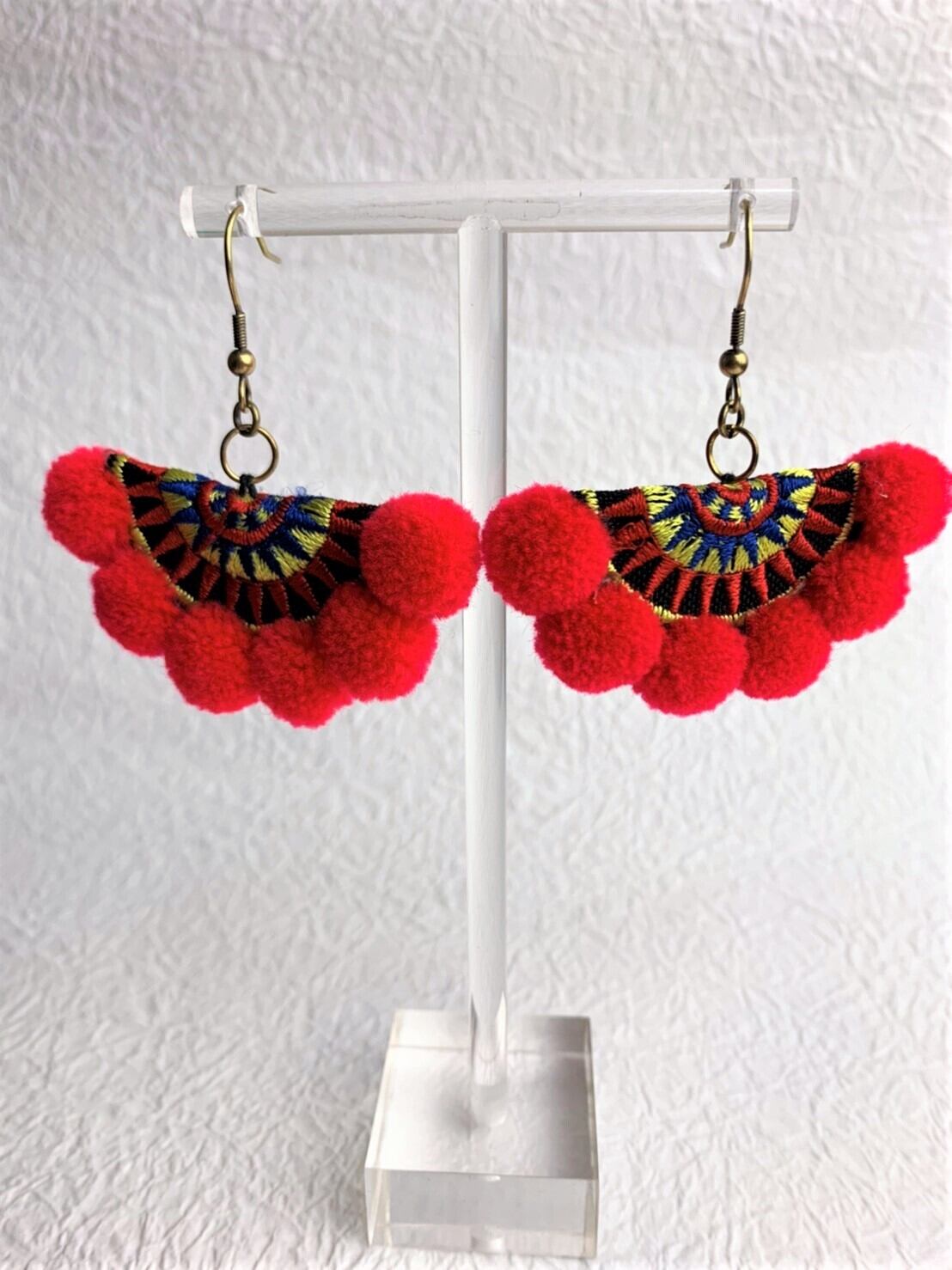 タイのモン族の民族衣装で使われるボンボンとワッペンを組み合わせて出来た作品です。オリエンタルな雰囲気を楽しんでくださいね!!