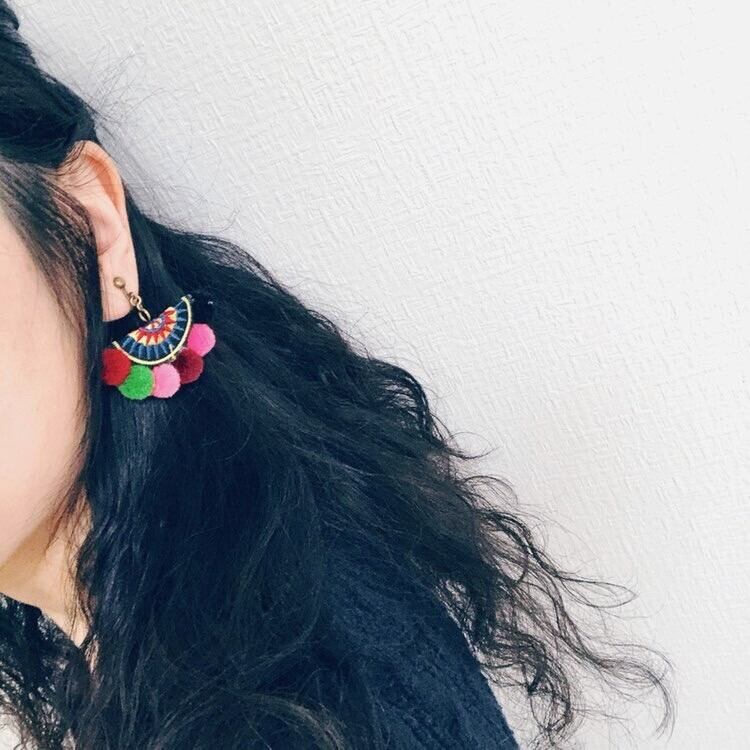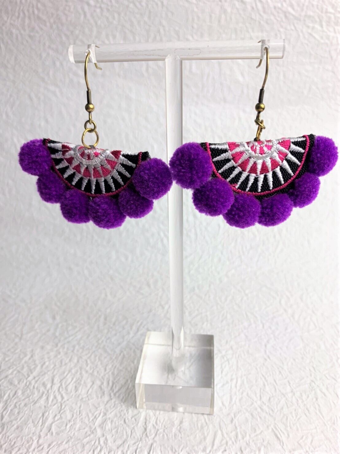 タイのモン族の民族衣装で使われるボンボンとワッペンを組み合わせて出来た作品です。オリエンタルな雰囲気を楽しんでくださいね!!